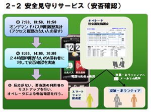 「安全見守りサービス」とは、高齢者・障害者の福祉・防犯の観点から、先の外出支援サービス」で活用するICTインフラと人的ネットワークを積極的に有効活用し、地域全体で高齢者の見守りサービスの提供を行うものです。スマートフォンを持った高齢者が、自身がけがをした場合、もしくはけが人を発見した場合などの緊急時に遭遇した場合に、簡単な操作で自身の位置情報をサーバーに送信します。すると受け取った情報はリアルタイムに社会福祉協議会のオペレータに通知されると同時に、地域内に存在する設置型バス予約端末にも通報され、社会福祉協議会職員や近くにいる方が駆けつけるという仕組みです。