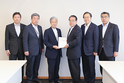 「平成30年豪雨災害」対策本部長(右から2人目)、宮崎災害対策本部事務局長(右端)に要請