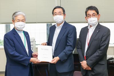 荒木会長は、まず激甚災害の早期指定及び消防・警察・自衛隊をはじめ国職員の派遣、他県・市からの応援職員の迅速な派遣に対するお礼を述べたうえで、被災者の生活支援や交通・通信インフラ、上下水道などライフラインの早期復旧を要望し、また、農林漁業や商工業等が大きな打撃を受け、住民にとって不可欠な地域経済の再生のため、国による全面的な支援が必要だと訴えました。特に、新型コロナウイルスの深刻な影響下での豪雨災害であり、復旧・復興には様々な課題があることも強調しました。内山山江村長からは、特に被害の甚大だった球磨村をはじめ球磨郡等被災地域の被害状況を説明のうえで、被害が広範囲におよび復旧・復興には長い時間がかかることから、継続的な力強い支援をぜひお願いしたいと要請しました。