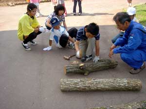この他に、県の移動式粉砕機(チッパー)を使い、間伐材をチップにして村の公園の遊歩道に撒いて整備したほか、今年の5月には、朝日小学校の児童(みどりの少年団)と間伐材を利用した、椎茸(しいたけ)の駒打ち作業を共同で行ない交流しました。ドリルでの穴あけや重い木の運搬など、子どもたちだけでは大変な作業も楽しくできたようです。