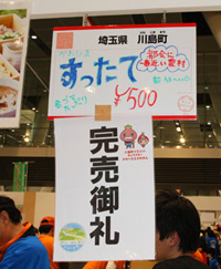 各町村のグルメ食材を調理・販売する「町イチ!村イチ!食堂」では、54町村の郷土料理などが振る舞われました。東京初出展となる石川県津幡町「つ~バーガー」、 群馬県玉村町「たまロンスティック」、埼玉県川島町の郷土料理「すったて」、冬にはありがたい秋田県三種町「じゅんさい汁」、山形県小国町「きのこ地鶏鍋」など、多くの方々が、 普段東京では味わえない逸品を堪能していました。当初、苦戦を強いられた町村も、来場者に大きな声でアピールするなどして、ほとんどの町村が完売していました。 来場者からは「美味しかった」という声が多く聞かれました。前回は、飲食スペースが少なかったことから、今回、スペースの拡大を図りましたが、それでも十分とはいえず、 食堂で購入されたものを立って飲食されている方が目立ちました。