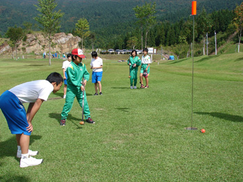 パークゴルフでは、小学4年生から中学3年生までの混合グループを作り、公認コースで年に2回教育課程に位置づけて行っている。小学1年生から3年生までは、 中学1年生との混合グループでグラウンドゴルフを行っている。こちらも年に2回行い、両方の種目に地域の方々がたくさん来て指導してくれている。ホールインワンをしたり、 藪にボールが入ったりするたびに、子どもたちの歓声がパークゴルフ場に響き渡っている。