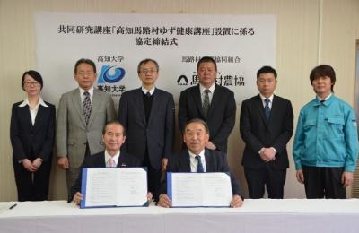 これらの取組を通じて、平成30年度からは、高知大学に馬路村農協との共同研究講座「高知馬路村ゆず健康講座」が設置されました。共同研究講座は、大学の研究者と民間企業等(馬路村農協)の研究者が、対等な立場で柚子の機能性について共同研究を行うもので、高知大学では初めて設置されたものです。