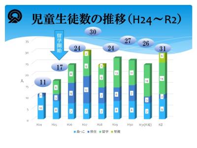 平成24年、児童生徒数が年々減少することから、将来の予測を調査してみました。すると平成30年には、島の中学生が2名だけになることが示されました。このままでは、同級生もいなく、先輩や後輩もほとんどいない学校生活を子どもたちへ強いることになります。さらには卒業後も同窓会さえできない粟島浦小中学校出身者となってしまいます。また、学校の存続さえ危ぶまれ、地域の衰退に拍車がかかることは明白です。児童生徒数の極端な減少は、教員数にも影響し、教育活動の質そのものにも影響を及ぼします。学校の存続にかかわる問題です。